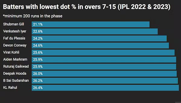 The right-hander has been very successful in the middle-order in ODIs and has all the ingredients to do the same in the 20-over format. Across IPL 2022 and 2023, Rahul averaged 106.33 versus spin (while striking at 123.64). Since 2022, Rahul also has the 10th-best dot percentage in the middle overs. That strike rate is a concern but if he can get it up to 130-135, Lucknow have Marcus Stoinis and Nicholas Pooran to take care of the scoring rate.