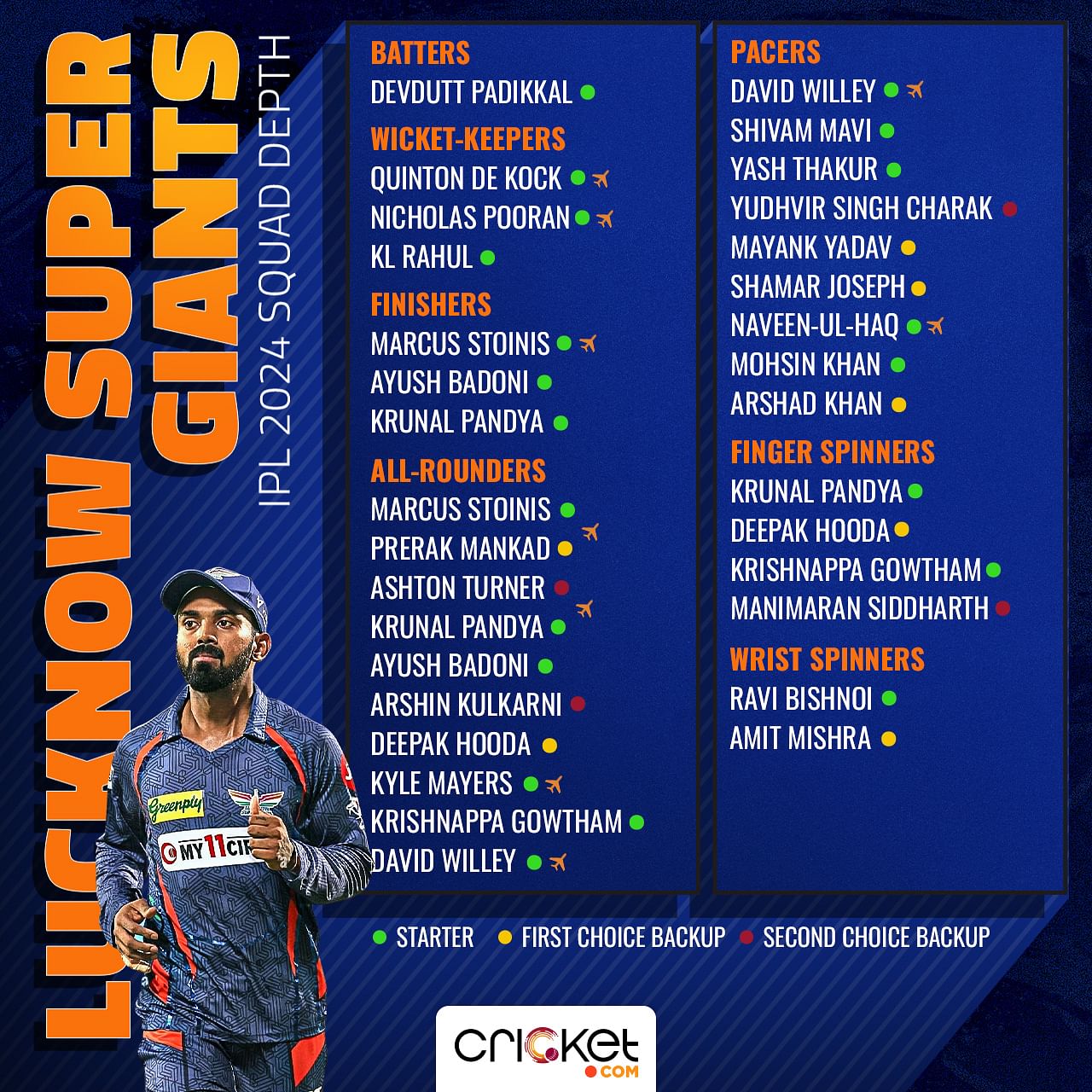Quinton de Kock*, Devdutt Padikkal, Marcus Stoinis*, Nicholas Pooran*, KL Rahul (c & wk), Ayush Badoni, Krunal Pandya, K Gowtham, David Willey/Naveen-ul-Haq*, Shivam Mavi, Ravi Bishnoi, Mohsin Khan (impact player)