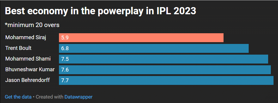 No other bowler in the league registered an economy under 6.8 in the powerplay; Siraj was in a league of his own.