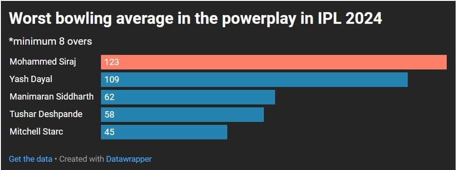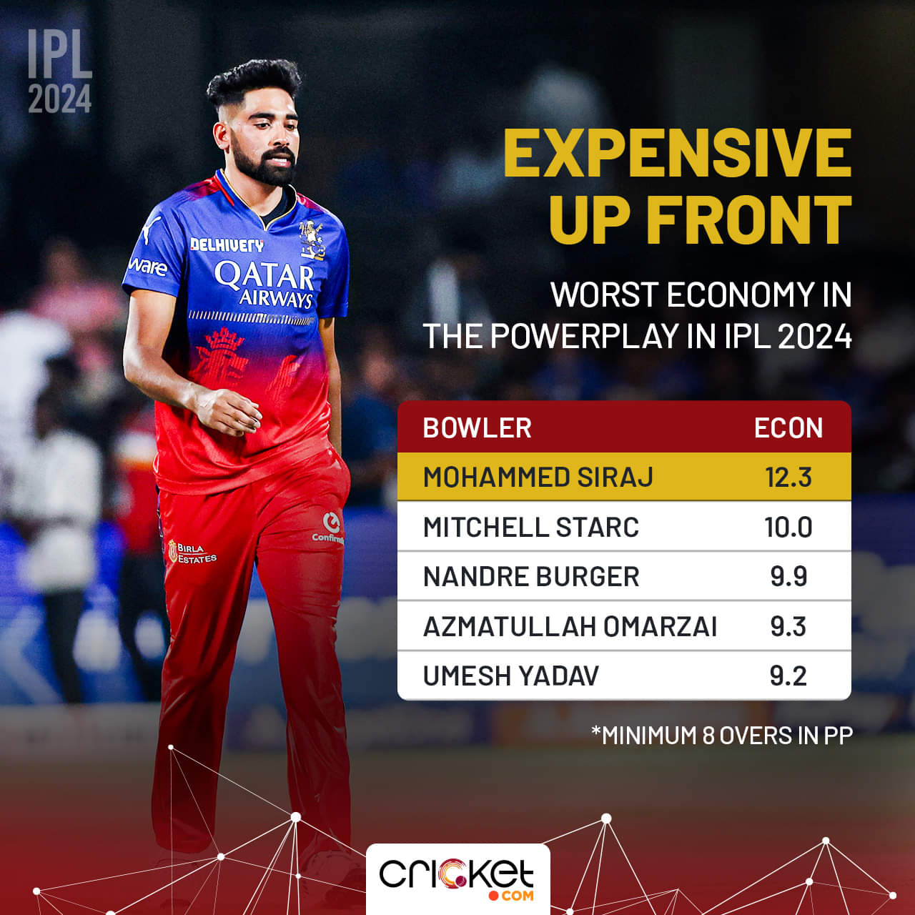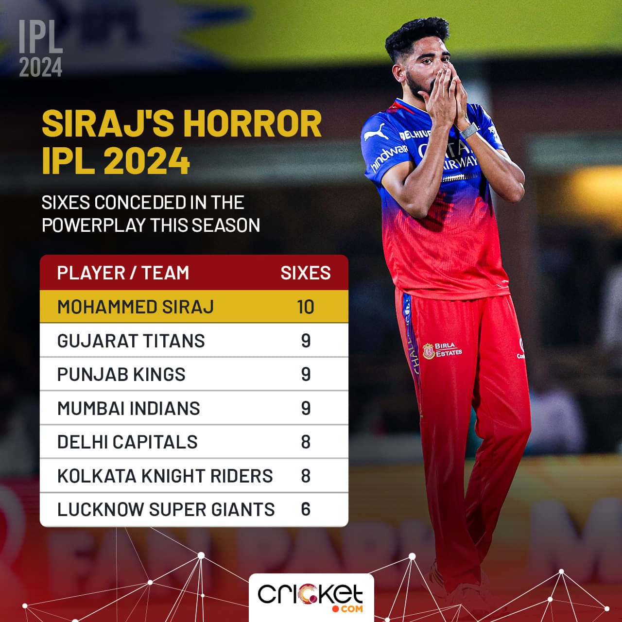 Six games into IPL 2024, here’s what Siraj’s powerplay numbers look like: 10 overs bowled, 123 runs leaked, economy 12.3 and 10 sixes conceded.