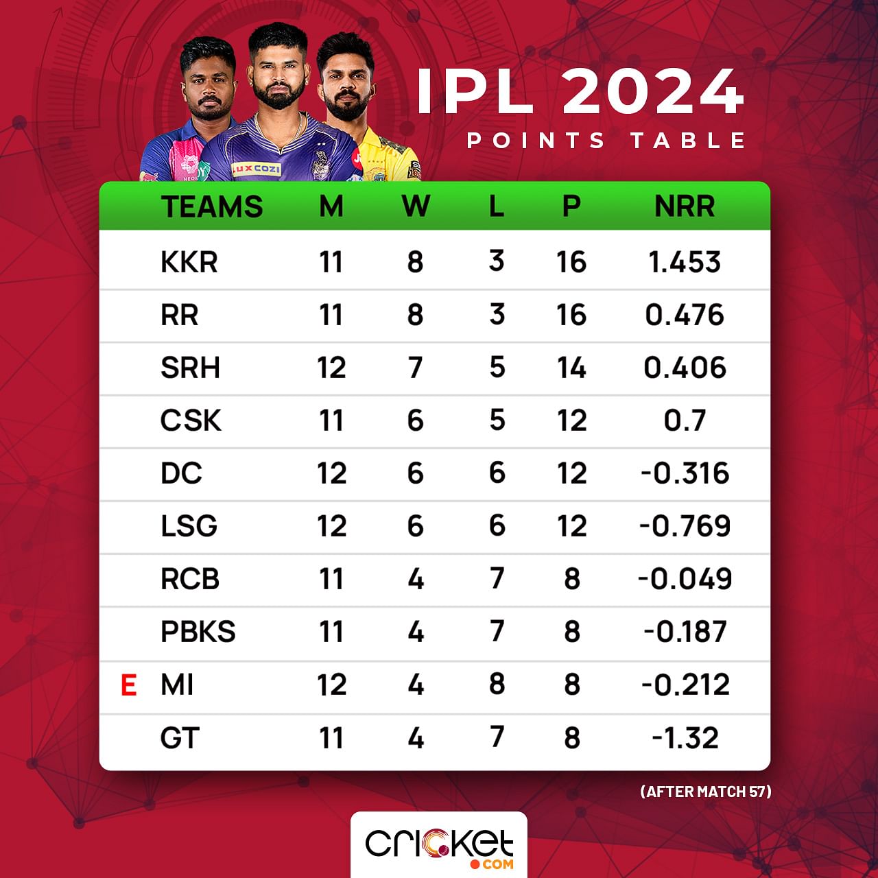 With SRH defeating LSG, Mumbai became the first team to be knocked out of the playoffs race. The five-time champions, currently placed at No. 9, have won four of their 12 encounters and can now maximum get to 12 points.