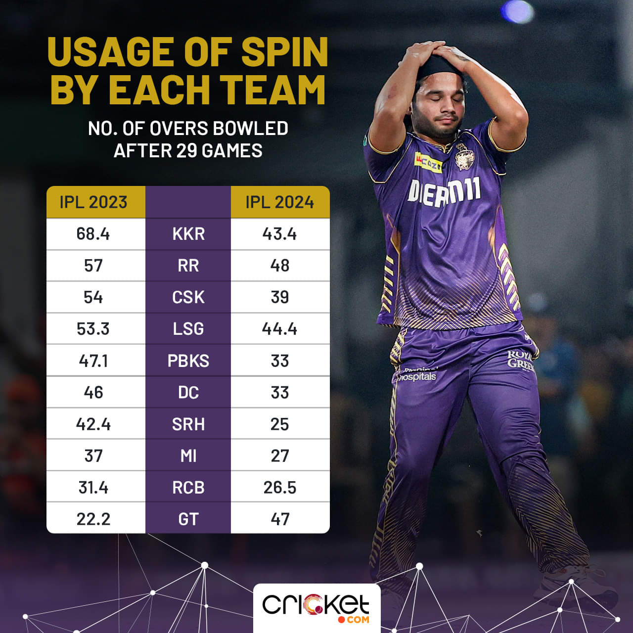 In fact, they are not the only ones. Apart from Gujarat Titans, there’s not a single franchise this year who have used more overs of spin than what they did by this stage of the IPL 2023. Kolkata Knight Riders had 68.4 overs of spin after six games in the IPL 2023, which is now just 43.4 after five matches in this edition.