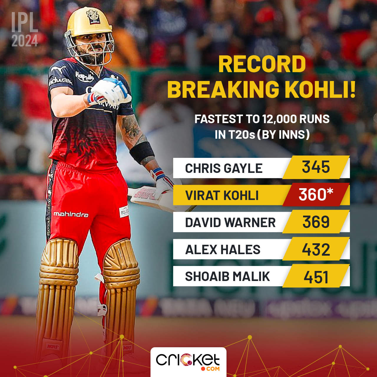Virat Kohli could score only 21 off 20 against Chennai Super Kings in the first game of the Indian Premier League 2024 on March 22 (Friday), but that was enough to make him the first Indian batter to cross the 12000-run mark in T20s.