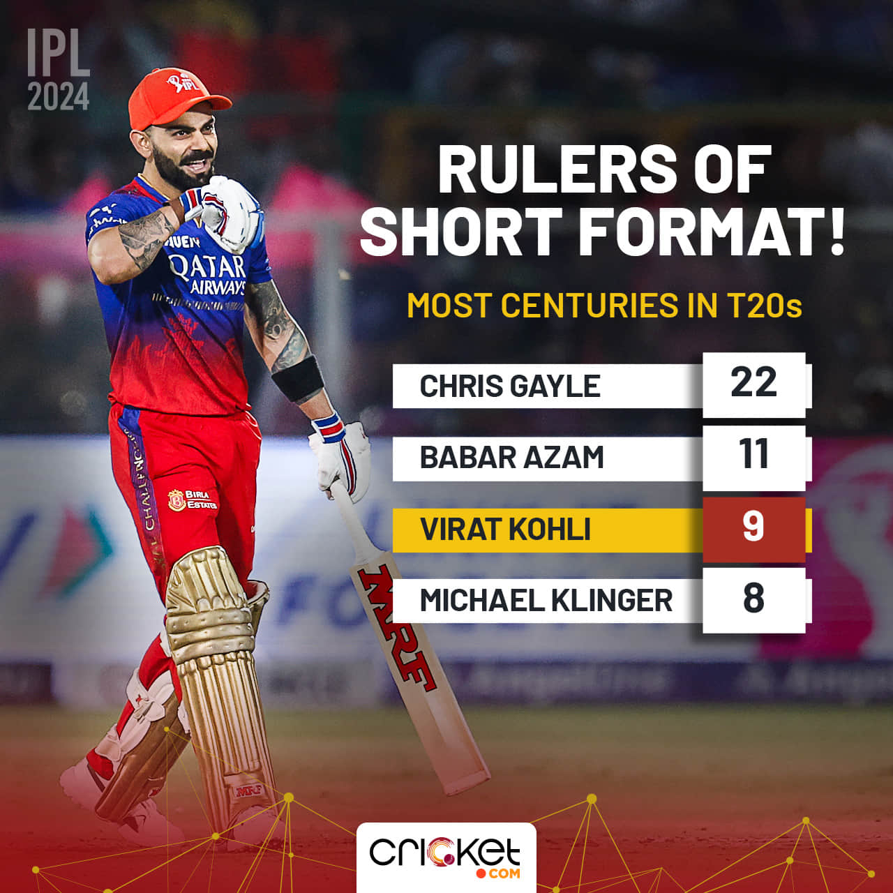 Prior to the game tonight, only two batters had hit nine or more centuries in T20 cricket: Chris Gayle and Babar Azam. Well, post his ton against the Royals, Kohli joined the elusive list to become the batter with the third-most hundreds in T20 history. He has a long way to go to catch the Universe Boss, but Kohli is now only two shy of Babar, who has hit 11 T20 centuries.