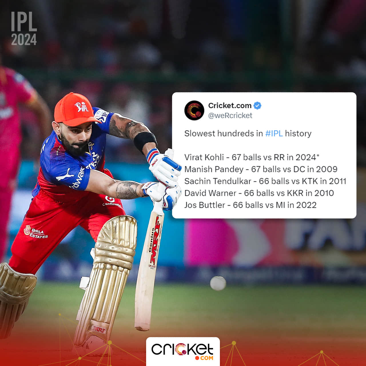 On the night, Kohli also ended up equalling an unwanted record. He ended up registering the joint-slowest hundred in IPL history after bringing up his ton off 67 balls. He equalled Manish Pandey, who in IPL 2009 struck a ton of 67 balls against Deccan Chargers, also coincidentally representing Royal Challengers Bengaluru (RCB).