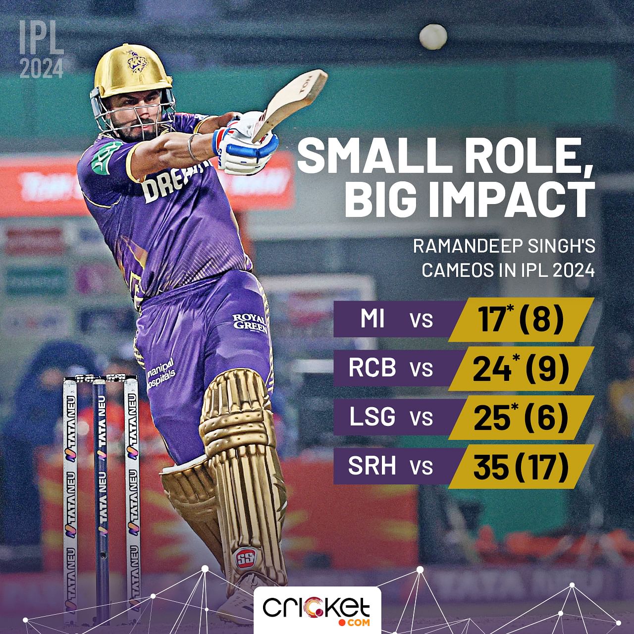 Ramandeep Singh in IPL 2024 has been the definition of ‘small role, big impact’. The 27-year-old has batted only 62 balls this season, but has been integral to KKR's success.