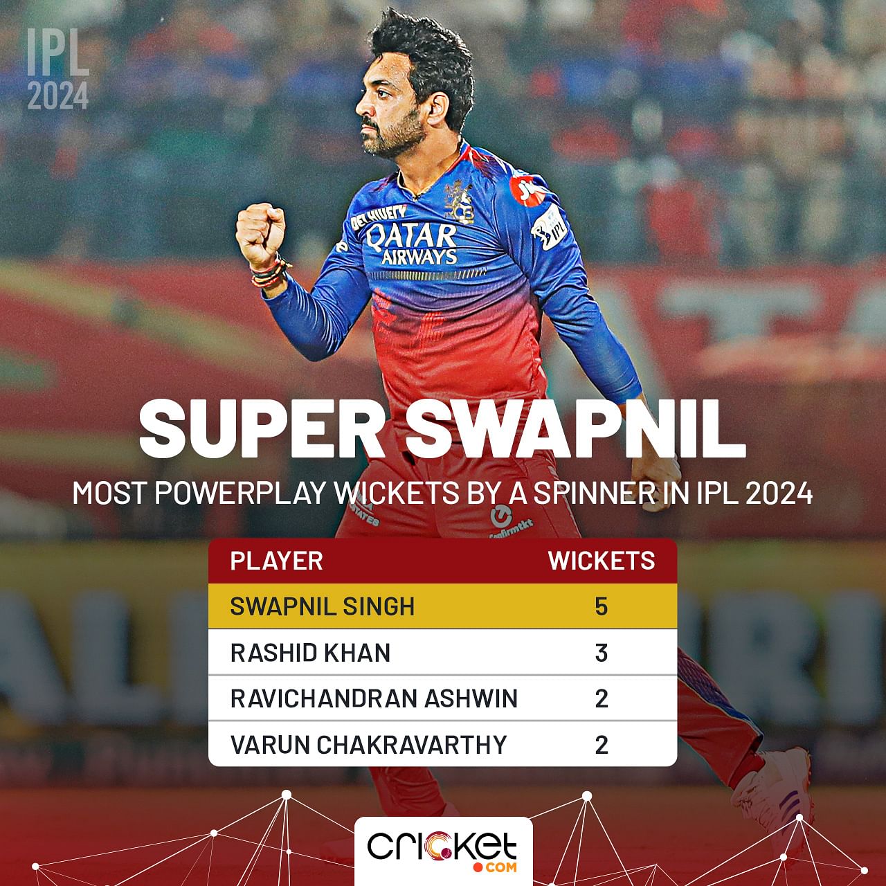 An unlikely candidate who's been integral to Royal Challengers Bengaluru’s turnaround this season is 33-year-old Swapnil Singh. The left-arm spinner has only bowled a total of 11 overs, with six of them coming in the powerplay. He’s taken five wickets in these six overs — the most by a spinner in the powerplay this season.