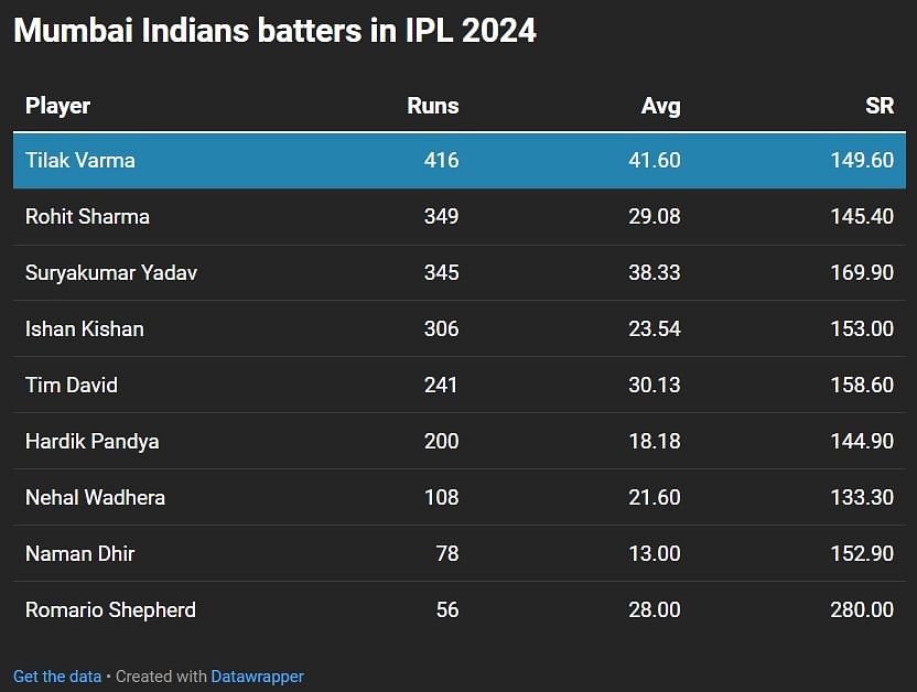 Tilak has, by some distance, been MI’s best batter this season. He is the only MI batter to score over 400 runs this season, and he’s maintained a very healthy overall strike rate of 149.6
