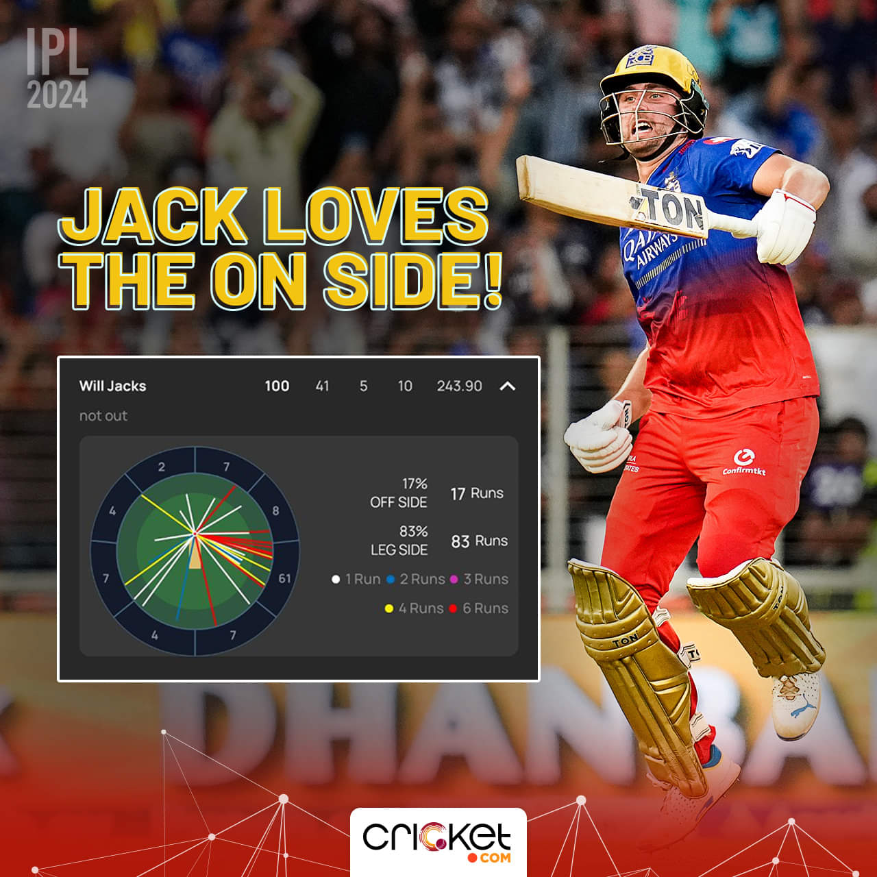 Jacks slammed 10 sixes in total and all of those came through the leg side, with the majority of them going over the deep mid-wicket fence. In fact, 83 of his 100 runs came through the on side. Jacks’ hitting was unreal and it even left Kohli awestruck who was laughing in disbelief.