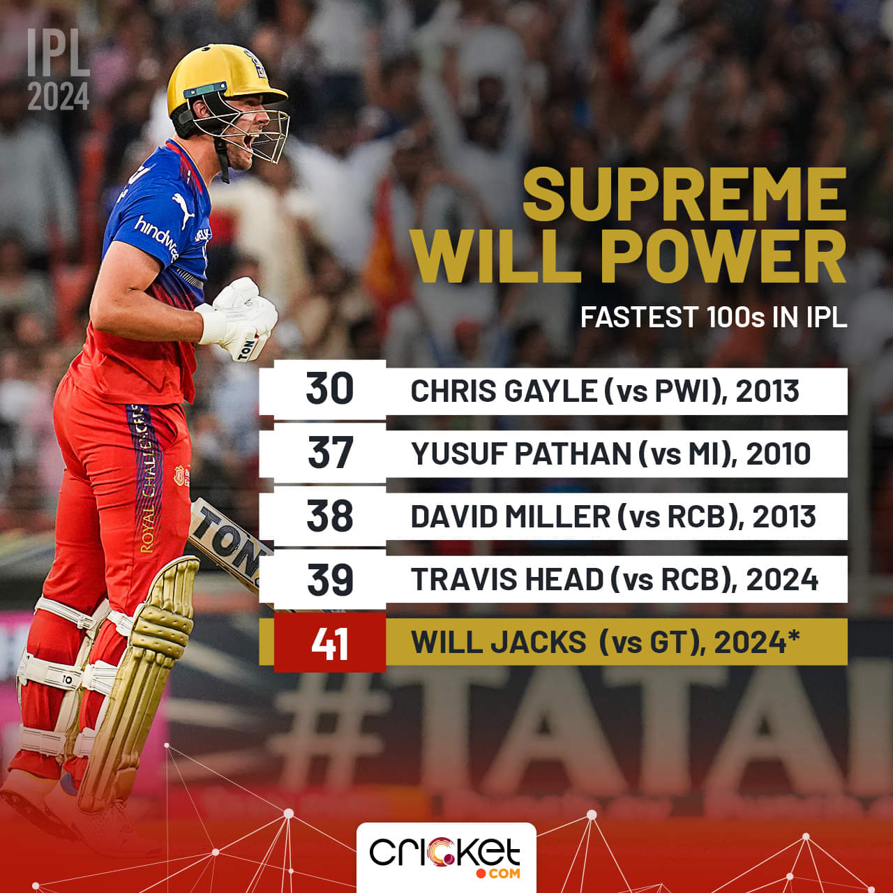 Jacks got to his ton with a six off Rashid and RCB finished the game with 24 deliveries to spare, the most number of balls left in a 200-plus target ever in T20s.
