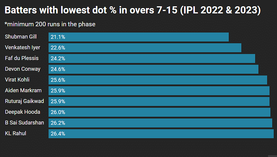 Since 2022, Rahul has a dot percentage of just 26.40% in overs 7-15, which is 10th best among 31 batters who have scored 200 or more runs in the middle-overs across the last two seasons.