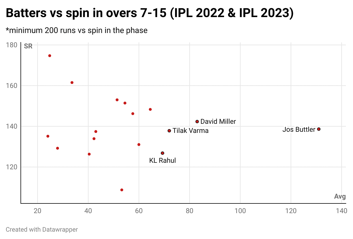 Across IPL 2022 & 2023, he averaged a staggering 106.33 versus spin (while striking at 123.64). The numbers in the middle-overs (7-15 phase) against spin were impressive too, with him averaging 69.33 while striking at 126.83.