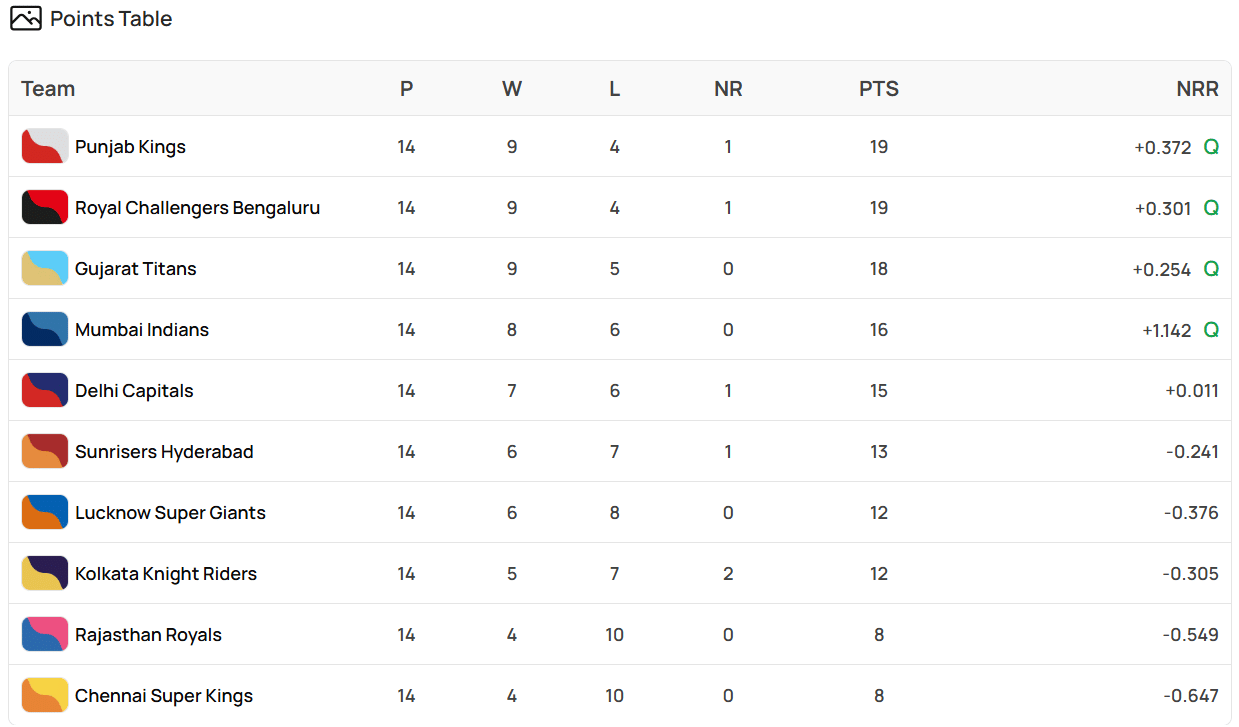 RCB finished the league stage at No.2 on the IPL 2025 points table, just below Punjab Kings (PBKS). Both teams finished with 19 points, but PBKS finished at the top because of their superior NRR.