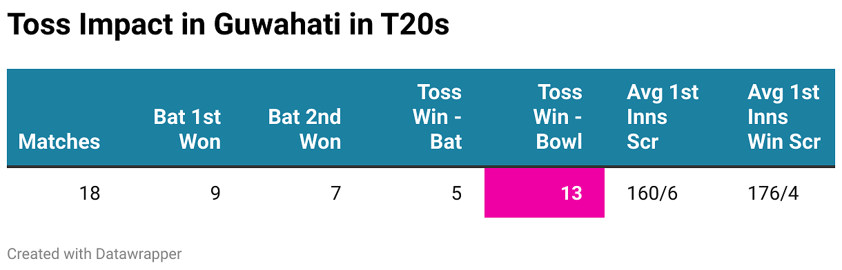 A total of 18 T20s have been held at the ACA stadium in Guwahati with teams batting first nine of those games. But, teams have opted to chase in 13 of those games.