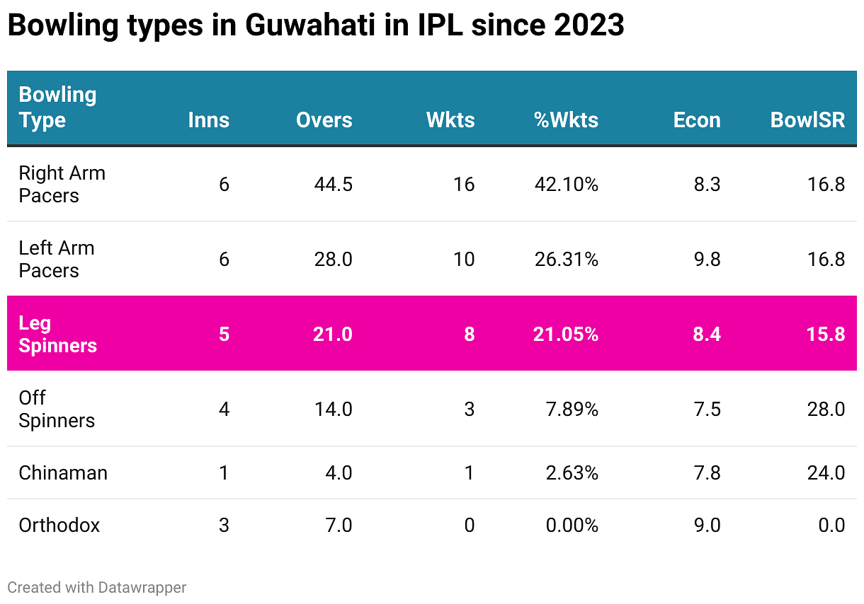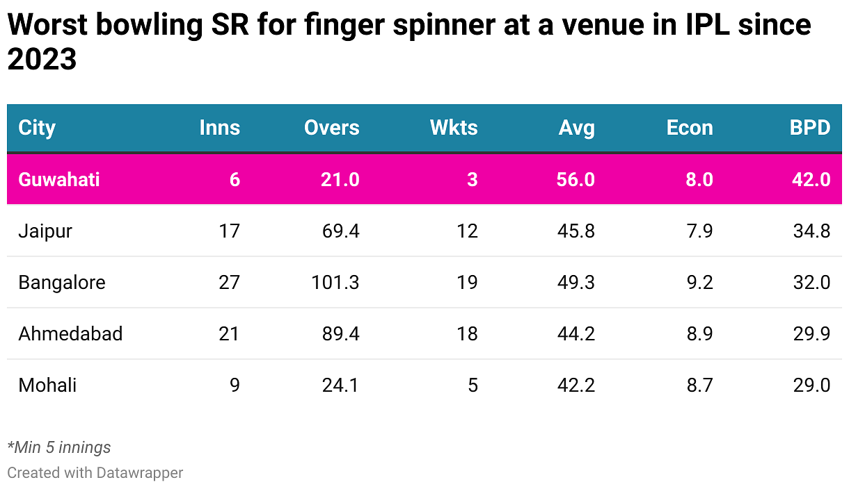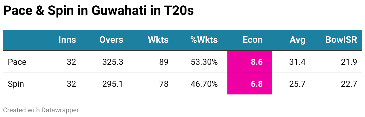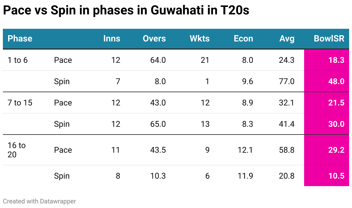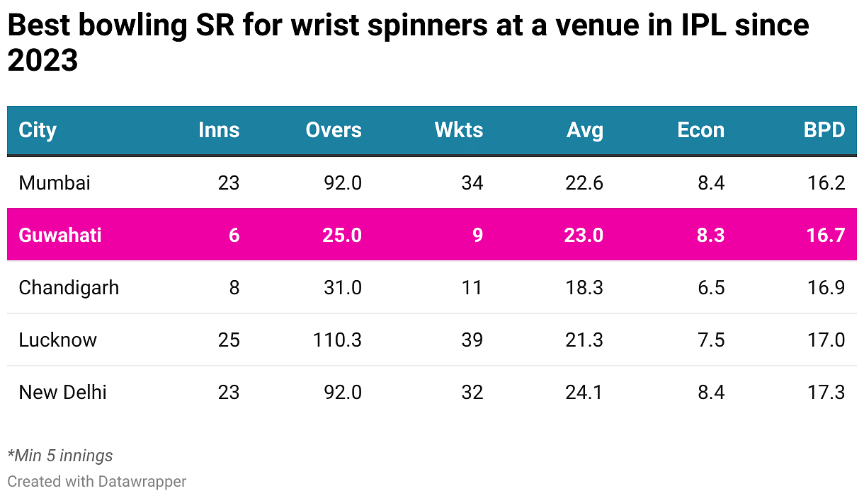 Wrist spinner have done well in Guwahati in contrary to finger spinners. They have bowling SR of 16.7 which is second best at a venue, bested by only Mumbai since 2023.