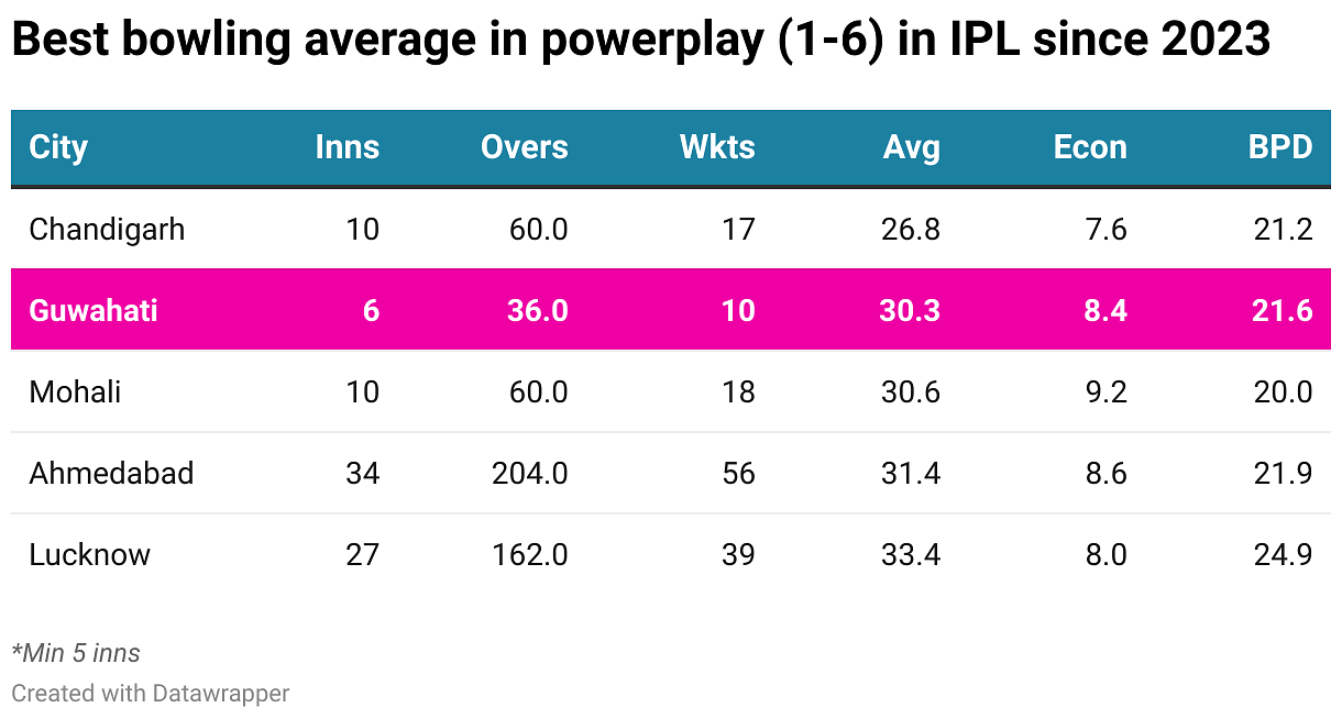 Powerplay is one of the best times for bowlers to bowl in Guwahati. A total of 10 wickets have been taken six games in this phase. The bowling SR of 21.6 is the second best bowling average in first six overs at a venue in IPL over the last two years.