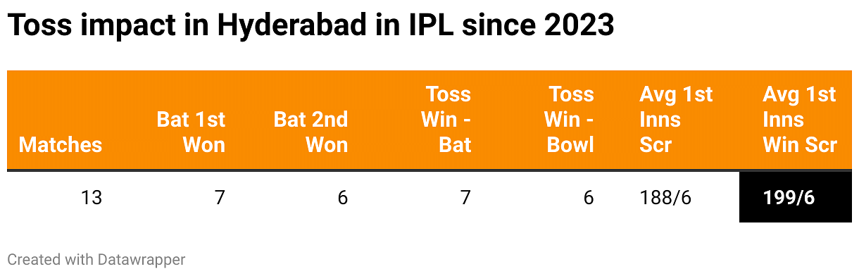 The Rajiv Gandhi Stadium has been a terrific batting paradise across the two seasons, with the average 1st innings score reading 188. However, even with big totals being posted, the win-loss record batting first and second is 50:50 as the pitch has tended to stay true — if not get better — throughout the course of matches. Thus, teams batting first need to have at least 200 on the board to be confident of defending.