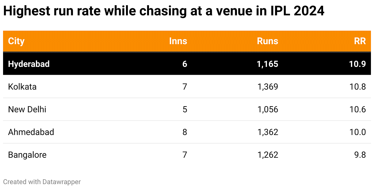 As mentioned earlier, the pitch in Hyderabad was a feast for the batters in IPL 2024 as batting became easier as the game progressed. This resulted in teams having the best run rate at this venue while chasing.