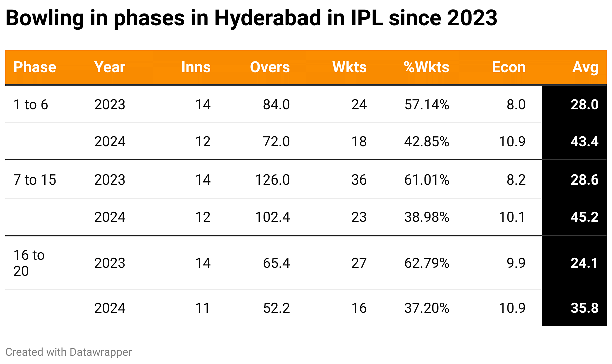 In the 2024 season, bowling became tougher in all the three phases as the economy rate skyrocketed past 10 runs per over. The bowling average, which was in mid 20s in 2023, shot up to 40+ in 2024, making it tough for bowlers to restrict runs.