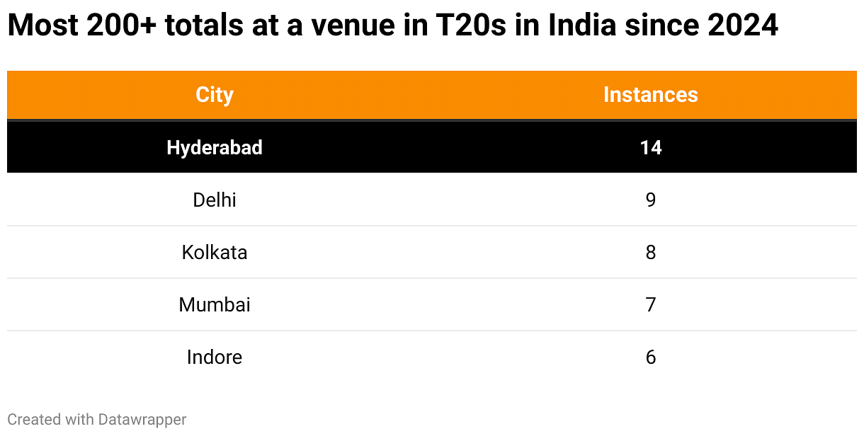 200+ totals have been scored frequently in Hyderabad over the past 15 months. Since 2024, no other venue in India has seen as many 200+ totals as Hyderabad. Team India, too, smashed their highest T20 total (297/6) in Hyderabad last October against Bangladesh.