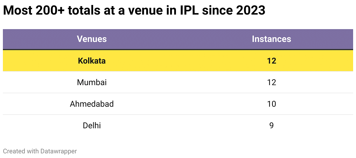 200+ totals have been a regular occurrence in Kolkata, which has seen the joint most 200+ totals in IPL over the last couple of seasons.