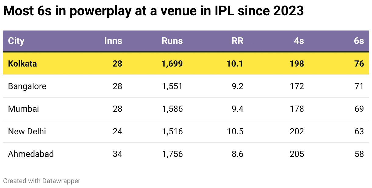 Batters have gone berserk against bowlers in powerplay as Kolkata has seen 76 sixes being hammered during the powerplay in the IPL since 2023, which is the most at a venue.