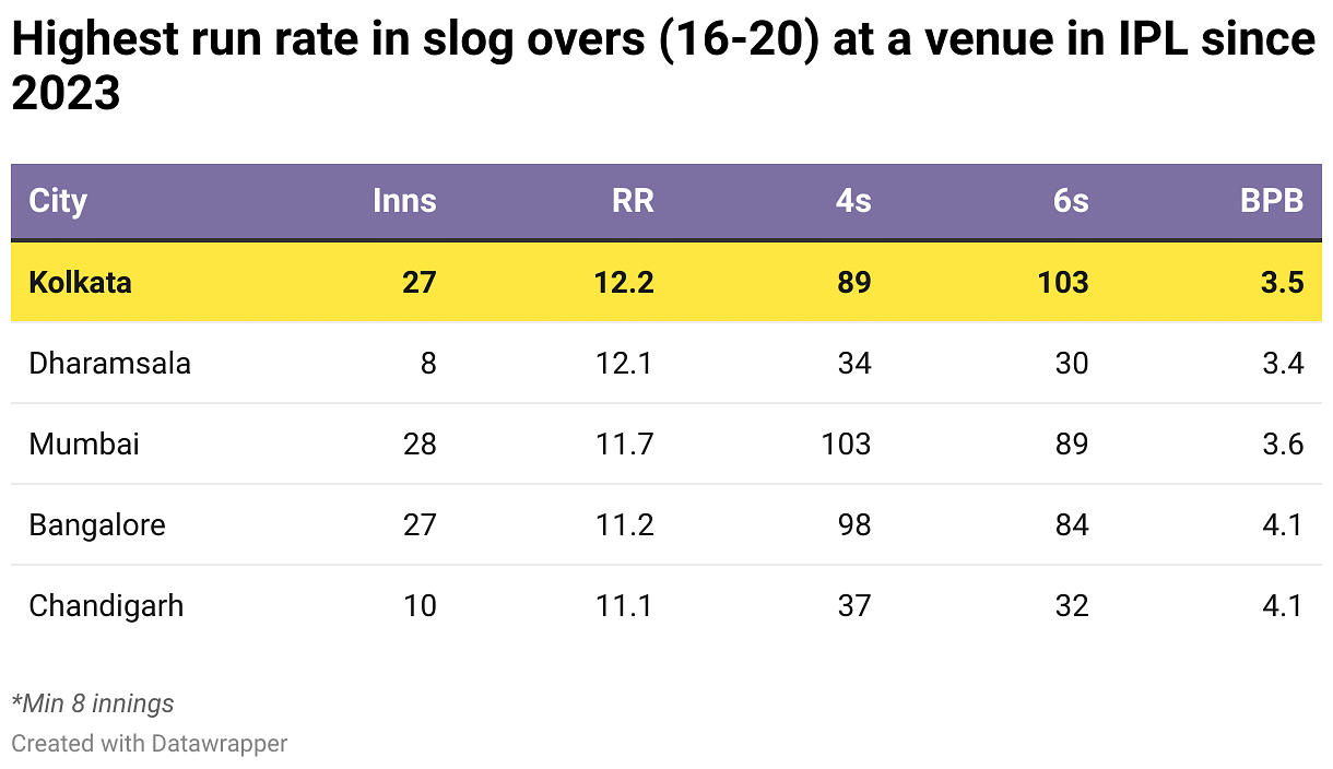 The slog overs at the Eden Gardens have been a display of batting dominance. With the likes of Andre Russell, Rinku Singh and Ramandeep Singh handling slog overs for KKR, they certainly have delivered, as it is the only venue to see over 100 sixes being hit in the final five overs.