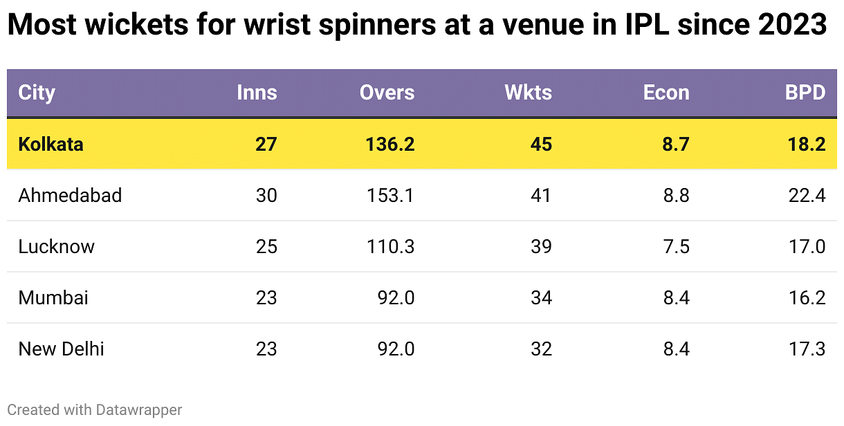 Wrist spinners have had a terrific time in Kolkata. In the last editions, they have taken 45 wickets, the most at a venue. Varun Chakaravarthy, Suyash Sharma, and other visiting wrist spinners have had good success in the IPL since 2023.