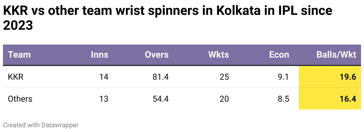 The visiting wrist spinners have done better in Kolkata than the KKR wrist spinners. They have taken almost the same number of wickets, bowling 25 overs less. They have a better economy and bowling SR than KKR spinners.