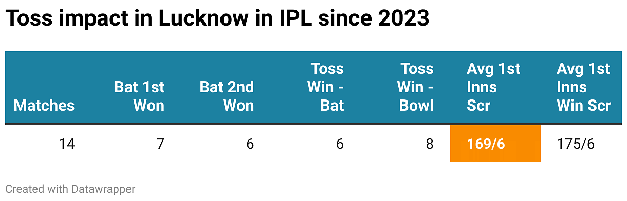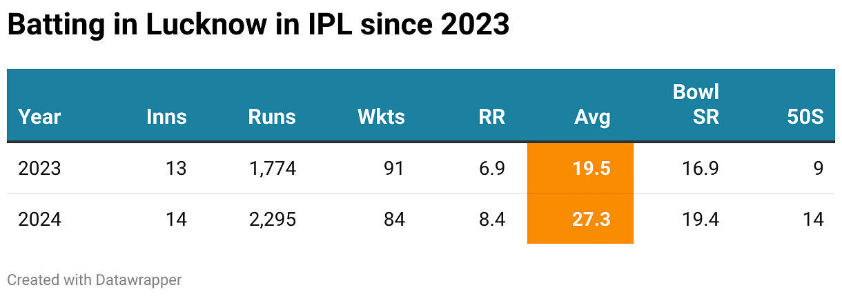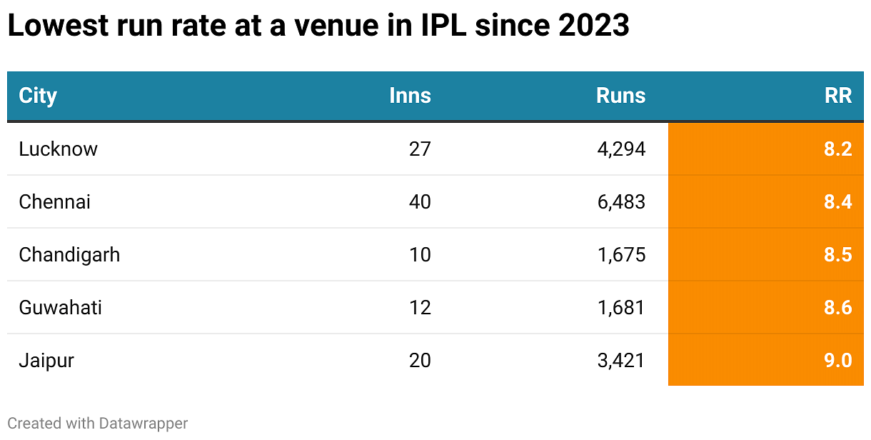 Over the last two years, the Lucknow pitch has been the toughest to bat on, resulting in the lowest run rate at a venue in the IPL.