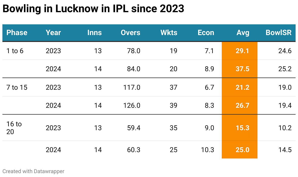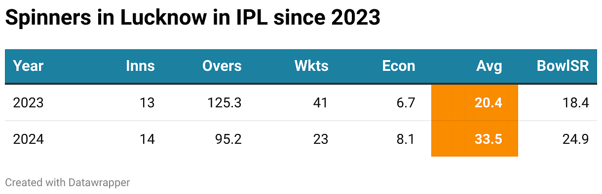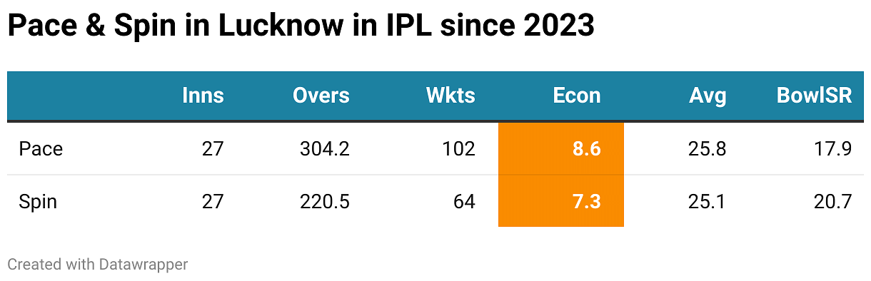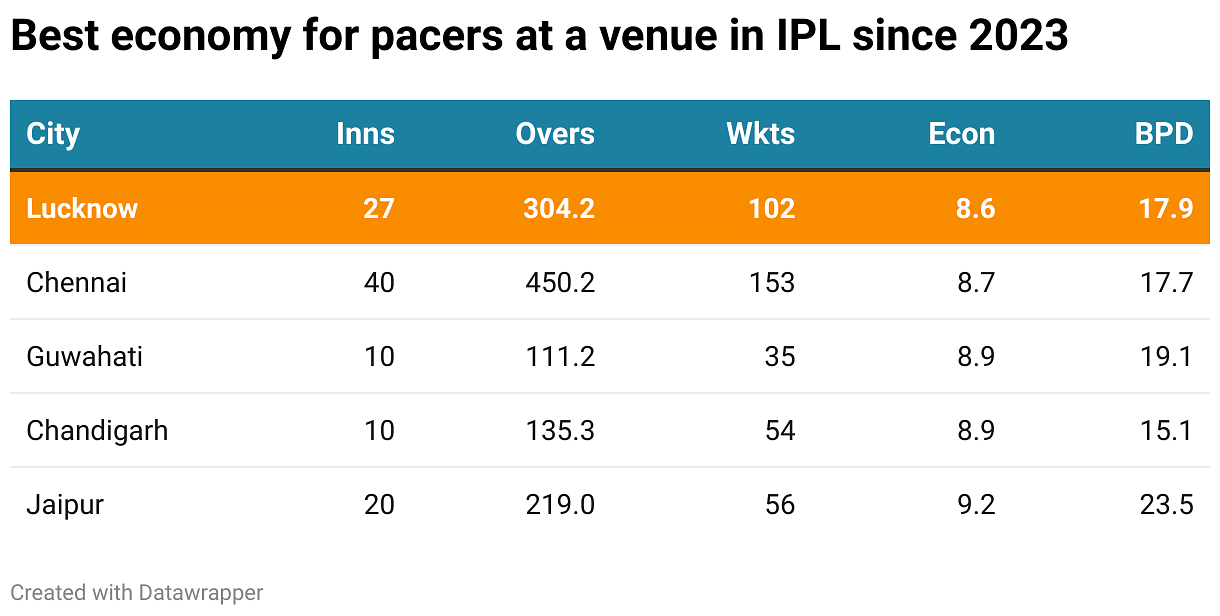 Pacers have had some sort of relief bowling in Lucknow after being hammered in every other venue. They have maintained an excellent economy of 8.6 which is the lowest for them at any venue.