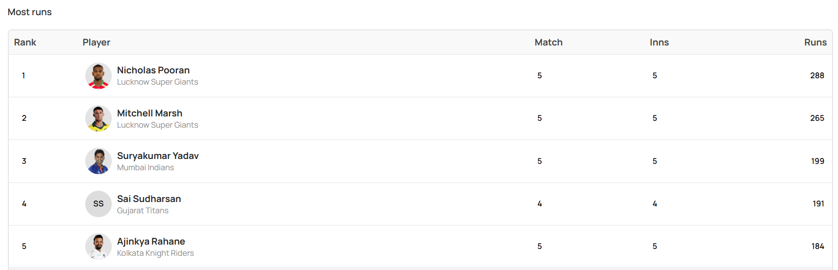When it comes to the Orange Cap, Nicholas Pooran is leading the charts after scoring 288 runs in five innings at a strike rate of 225 and has the Orange cap at the moment. His Lucknow teammate Mitch Marsh is second on the list with 265 runs in as many innings at 180.27. Meanwhile, Suryakumar Yadav is third with 199 runs in five innings at 150.75.