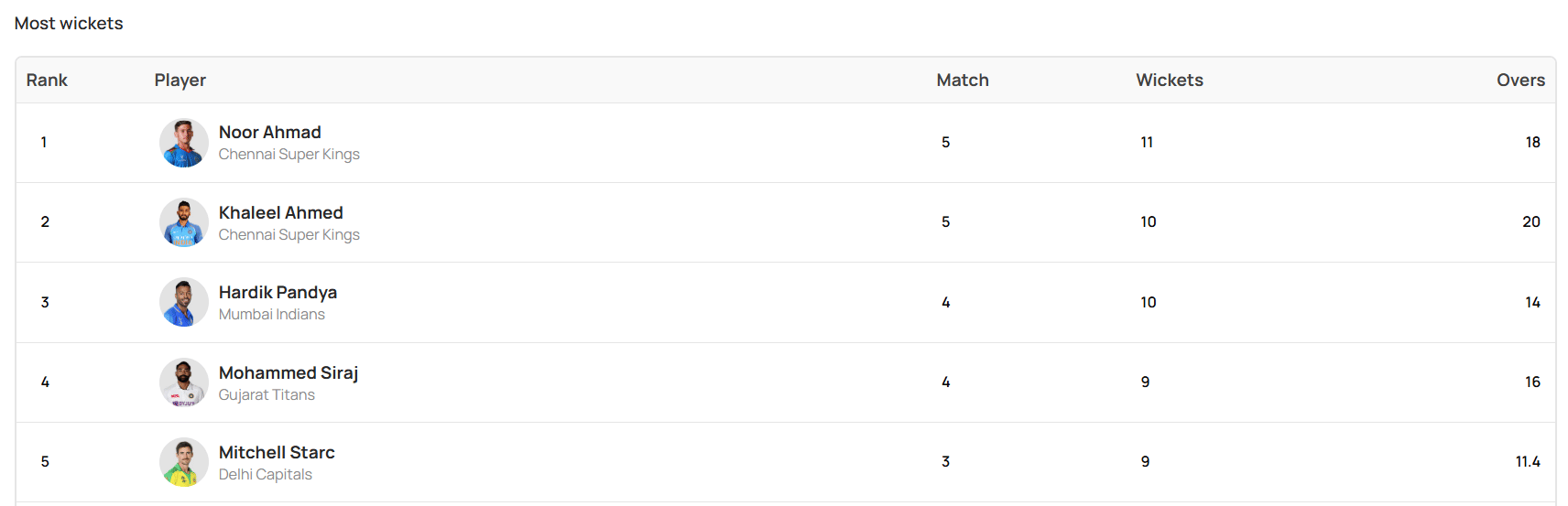 Afghanistan’s Noor Ahmad is currently leading the wicket-takers list and holds the Purple Cap after picking 11 wickets in five innings at an average of 13.6 and economy of 8.33. Mumbai’s skipper, Hardik Pandya, is in the second spot with 10 wickets in just four innings at 12 runs/over and an economy of 8.57. Meanwhile, CSK’s Khaleel Ahmed is third with 10 wickets in five innings at an average of 16.5 and an economy of 8.25.