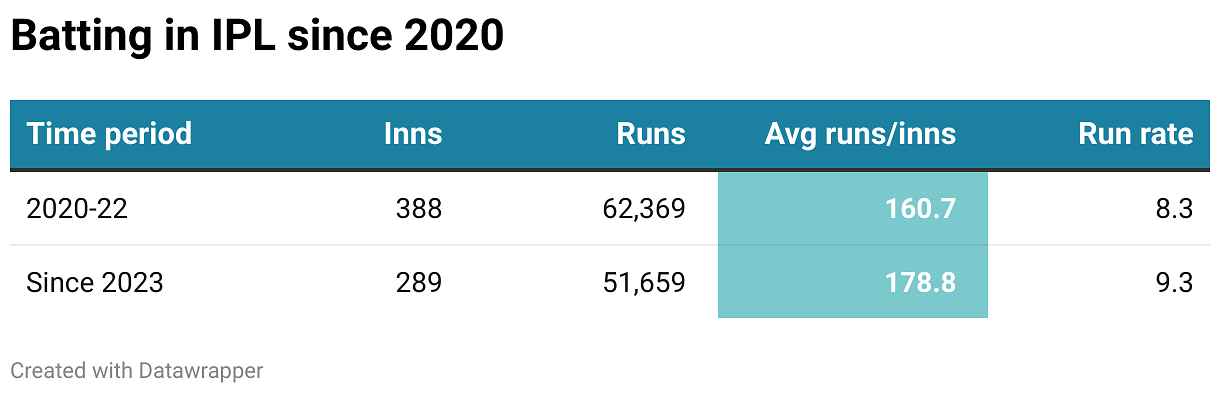 The quality of cricket in IPL has drastically changed over the last couple of years as records show batters have been dominating bowlers and smashing runs at a quick pace. The average runs per innings has gone up by nearly 20 runs from 161 to 179. The run rate has shot up from a mediocre 8.31 between 2020-22 seasons to 9.27 in the last two seasons.