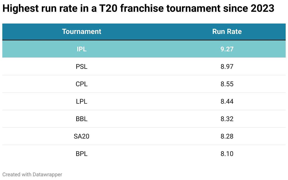 Amongst all the notable franchise T20 leagues across the world, IPL is the only league to have a run rate over nine runs per over. Pakistan’s PSL comes close second with a run rate almost touching nine at 8.97.