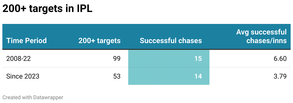 In the last two seasons, 200+ totals have been chased in 14 instances, with every fourth 200+ total run chase being successful. The best example is the game between KKR and PBKS in Kolkata in IPL 2024, where Punjab managed to chase 262 runs, making it the highest run chase in T20 cricket history.