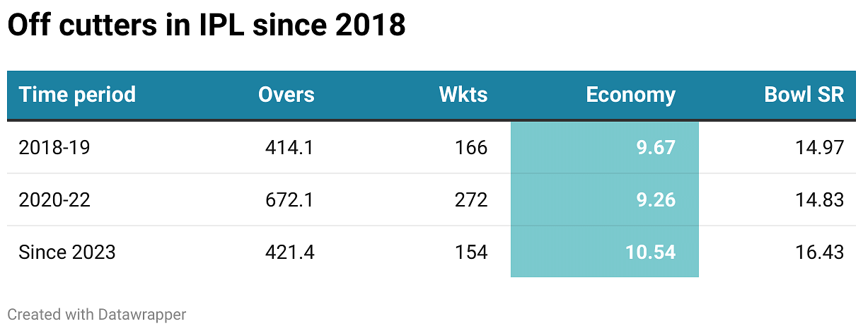 In the last two seasons, off-cutters' economy has gone up from 9.26 to 10.54. Harshal Patel is one of the prime examples of a bowler whose excessive use of the off-cut resulted in him being one of the most expensive bowlers in the competition.