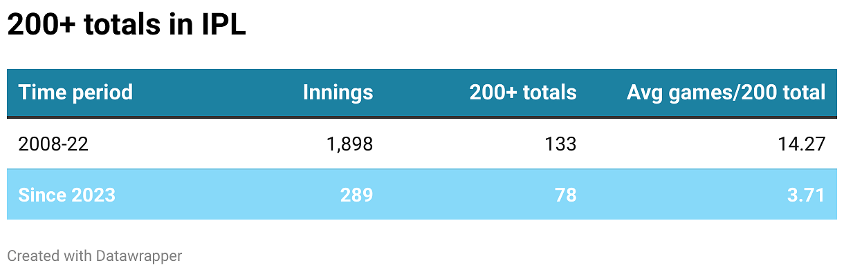 Scoring a 200+ total was seen as a big deal in the IPL a decade ago. In the first 15 seasons, a 200+ total was scored once every 14 innings. In the last two seasons, 200+ totals have been scored in 78 innings averaging once in every four innings.