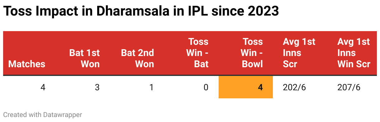 This venue has not been consistently utilised, as PBKS did not use this venue between 2014 and 2022. They returned to Dharamsala in 2023, hosting the last two home games for PBKS in both the 2023 and 2024 edition. The teams have chosen to field after winning the toss in all four games. However, the result has been opposite, as three of the four games have been won by teams batting first. The average first innings score of 202 gives an idea of the games being a run fest.