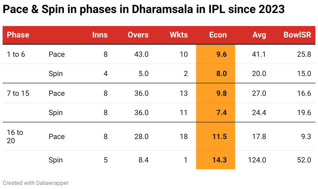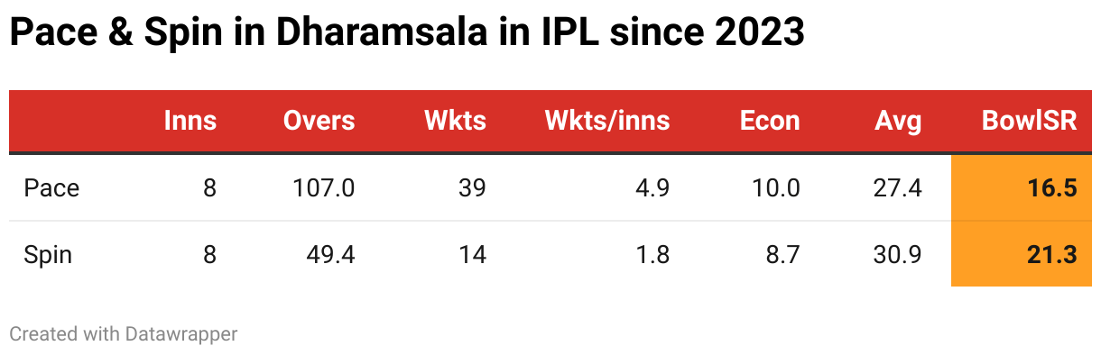 Pacers have gotten far more wickets than spinners at this venue, averaging five wickets per innings. They have a good bowling SR of 16.5 compared to 21.3 of the spinners. However, in pursuit of wickets, the pacers have been very expensive, going at 10 run per over.