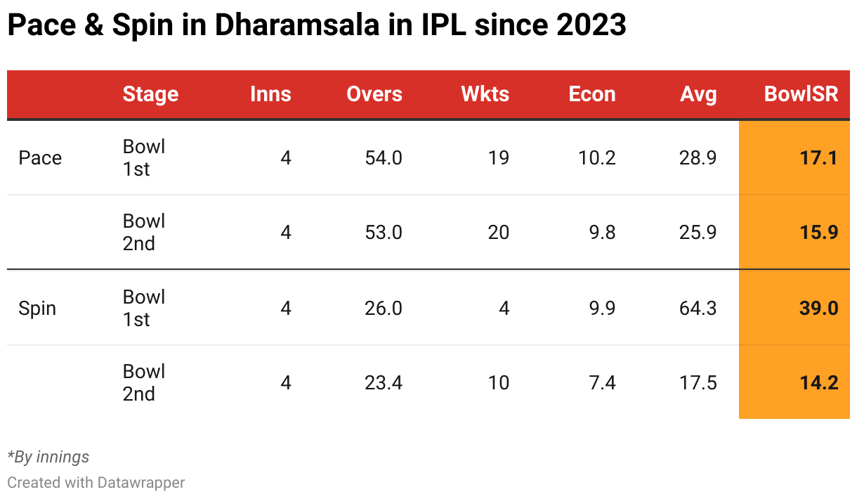 Pacers have found equal help irrespective of bowling first or second. The spinners have had contrasting returns as they have been expensive and wicketless while bowling first, striking at 39 compared to taking 10 wickets at 14.2 bowling SR while defending targets.