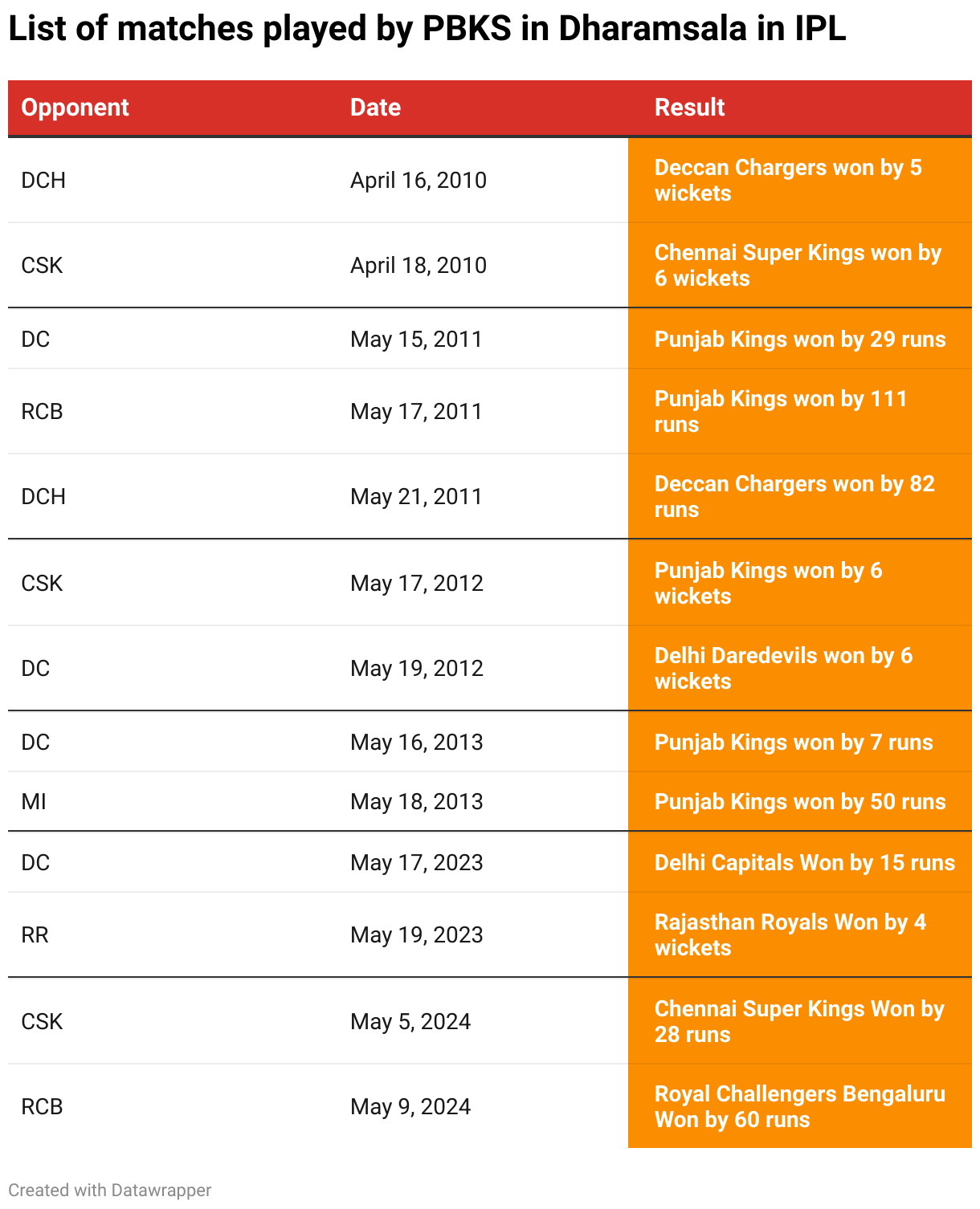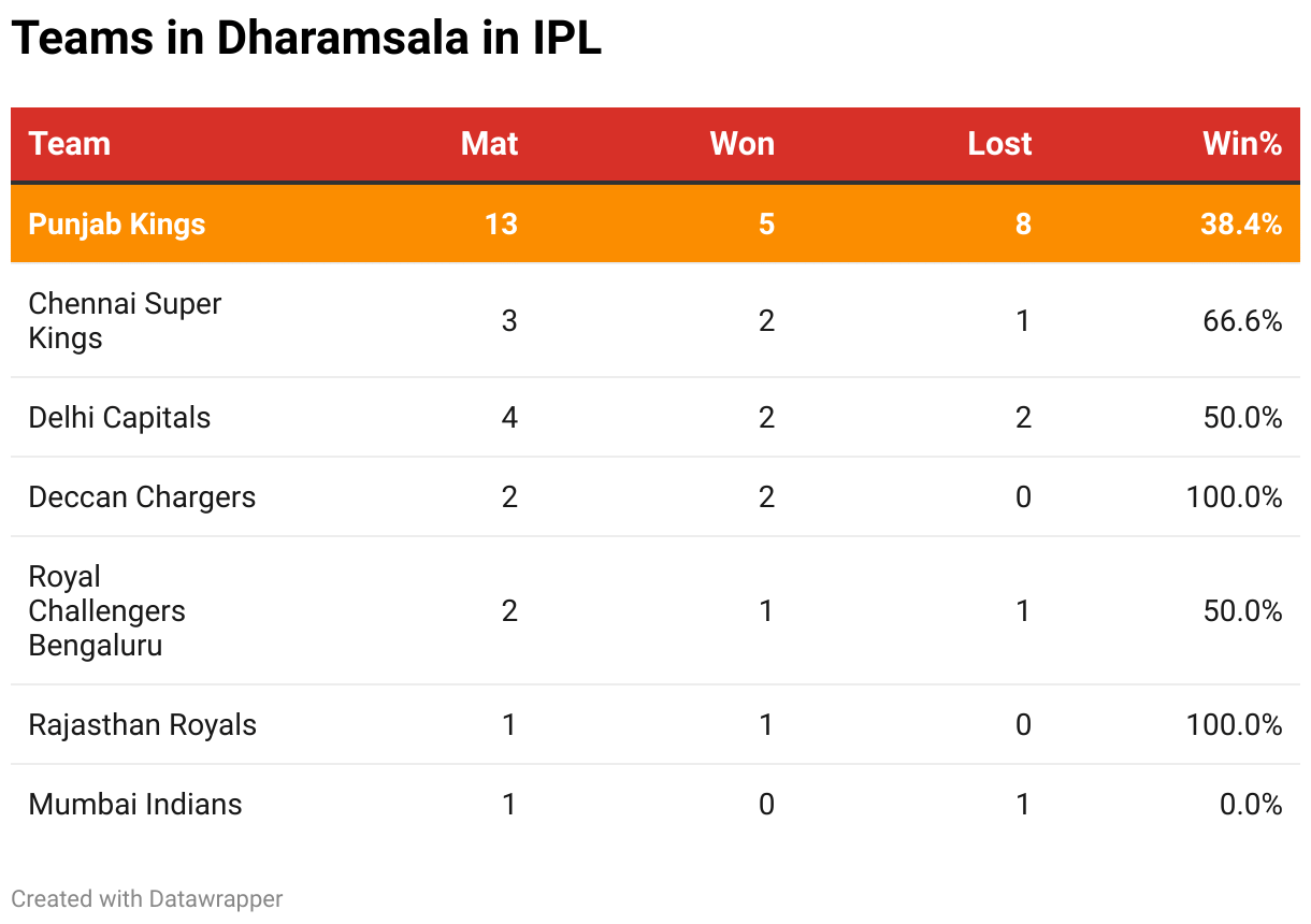 Punjab Kings have hosted games at this venue between 2010 and 2013, and then since 2023. They have played 13 games, managing to win only five of them. Delhi Capitals, who will play at this venue on 8th May, have won two and lost two games against PBKS here. MI lost the only time they played here back in 2013, and LSG will be playing here for the first time today.
