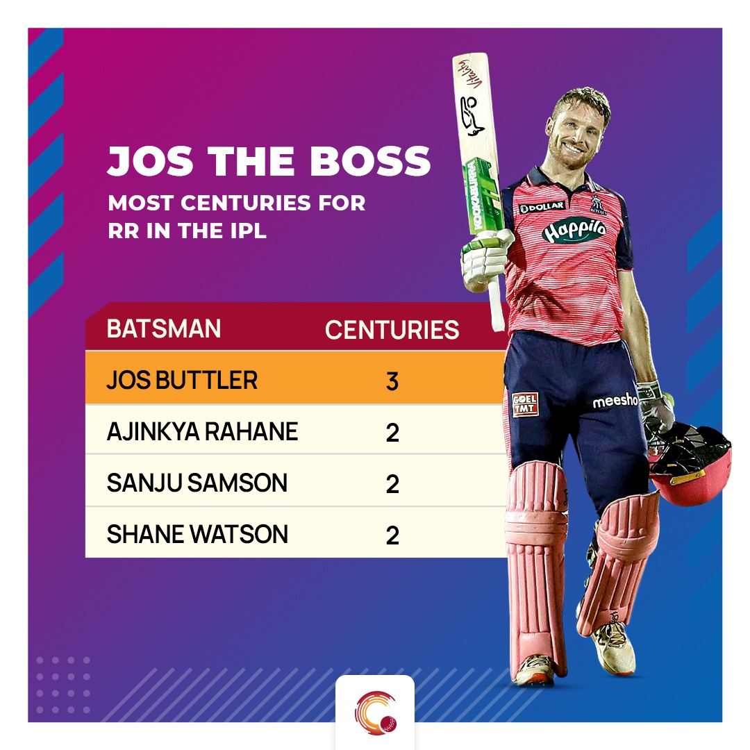 By virtue of his third ton for Rajasthan, Buttler now has the most centuries for the franchise in the IPL. Overall in the IPL, only two batsmen, Virat Kohli (5) and Chris Gayle (5) for Royal Challengers Bangalore have more centuries for a single franchise. In addition, Buttler became the first batsman for Rajasthan to register two tons in a season.