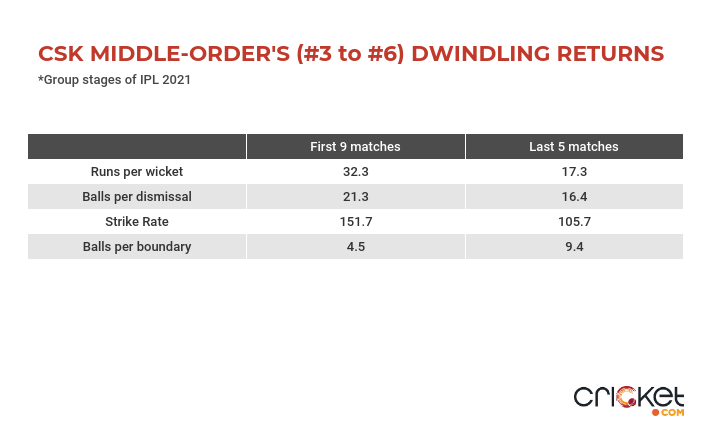 So much of CSK’s success in the initial part of the season was down to the intent, aggression and consistency showed by its middle-order, but of late the wheels have started to come off. In the last five matches, the CSK middle-order (No.3 to No.6) has averaged just 17.3 runs per wicket, while striking at a mere 105.7. These are figures unrecognizable from the numbers the middle-order batters put up in the first nine games, where they averaged 32.3 and struck at 151.7.