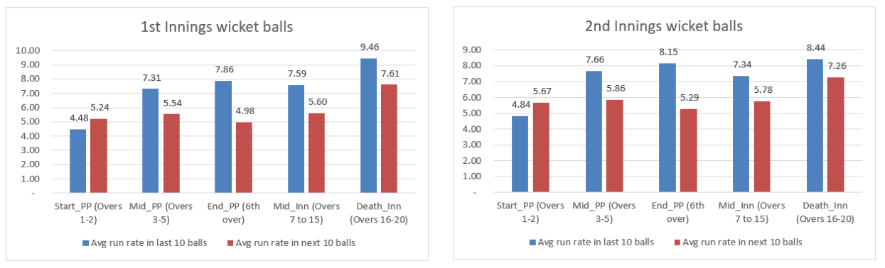 We have compared the run rate 10 balls before a wicket falls and 10 balls after it. The matches considered are T20s post 2018 across major leagues.