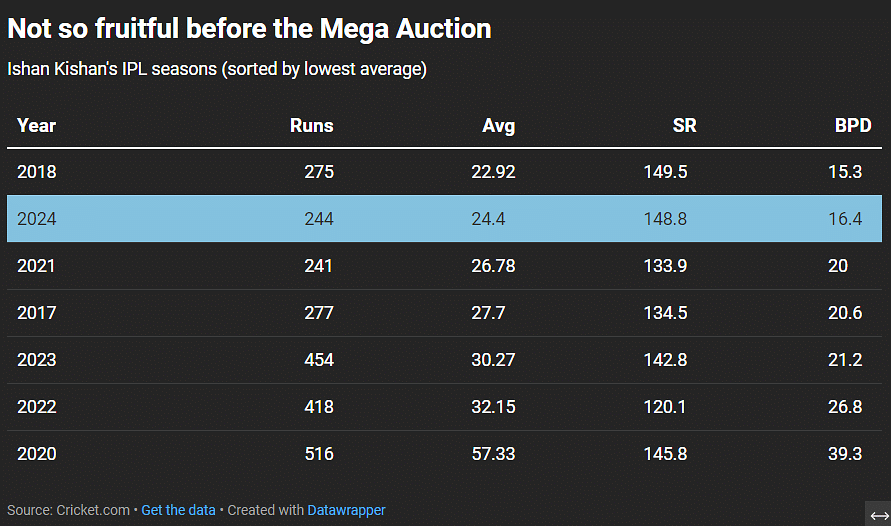 In the first two years after the auction, it felt like Mumbai were slowly but steadily getting the best out of the left-handed batter. Across 2022 and 2023, Kishan scored 400+ runs, but there was one thing that was stinging him: a good strike rate.