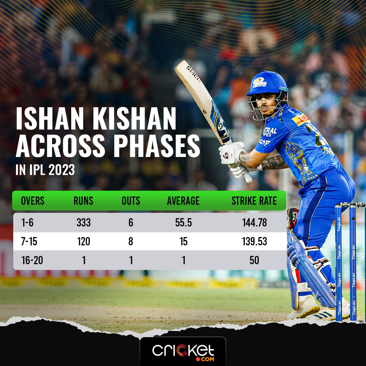 Just like his franchise, Kishan, too had a better record while chasing. The opener went at an average of 35.67 and a strike rate of 151.4 in the second innings compared to 22.17 and 125.5 in the first. Batting first, only twice in six innings, did Kishan have a strike rate of more than 125.