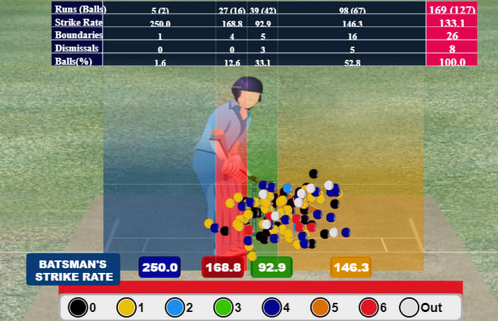 In 2022, Kishan had an average of 78.5 vs spin but his strike rate was just 127.6. This season, he had an average of 78 vs spin in the powerplay, which went down to 13 in the middle overs (7-15). Spinners were able to keep him quiet by bowling just outside the off-stump, as the graphic below suggests.
