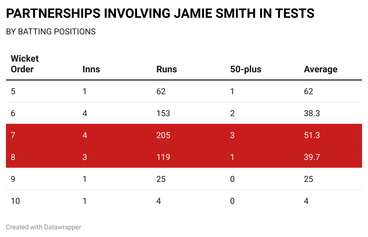At Lord’s, where Smith scored 70 on debut, he had a 52-run partnership with Woakes again for the seventh wicket. He replicated that stand against Sri Lanka, adding another 52 runs to take England into the lead. In only his fourth Test, the right-hander has been a part of seven 50-plus stands in 14 partnerships. It is quite an impressive ratio for a lower-order batter.
