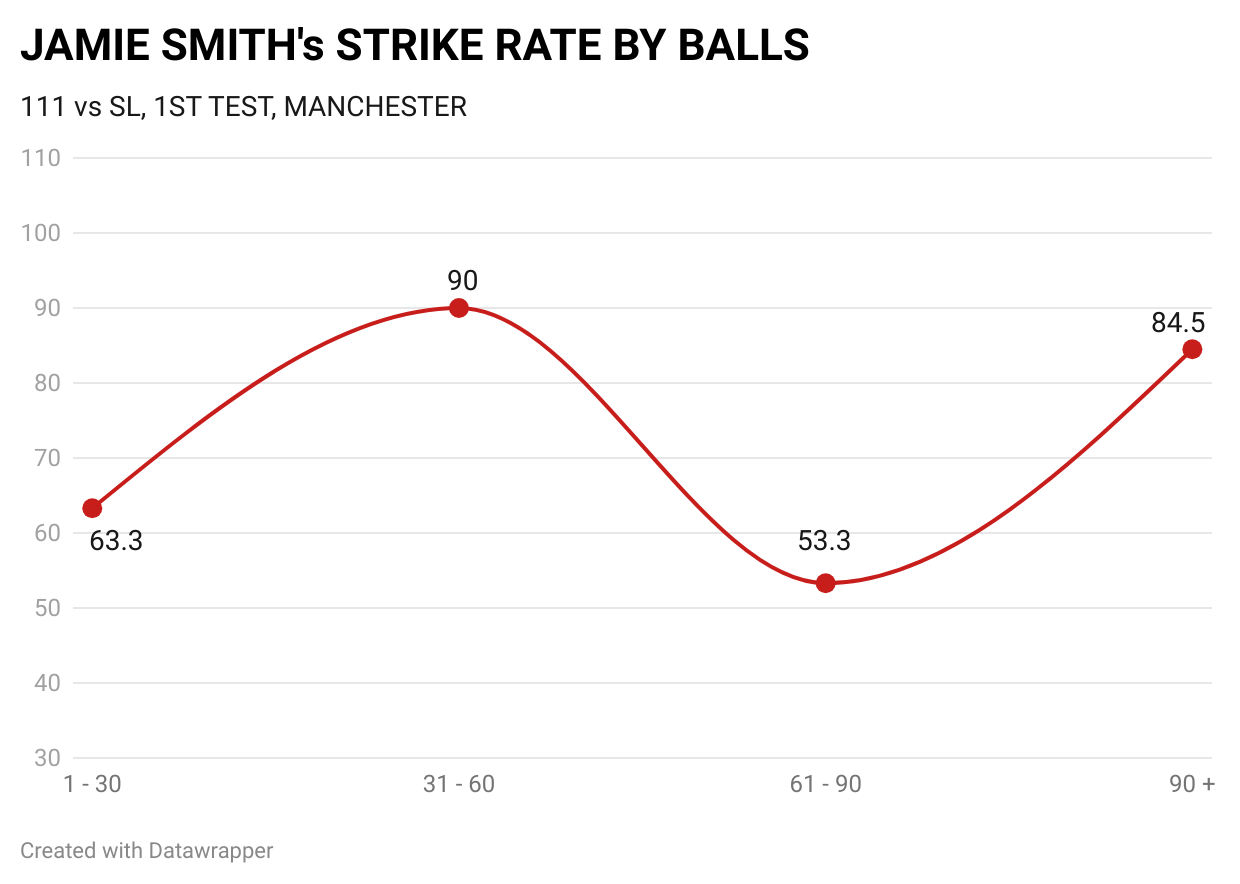 Smith walked in to bat on Day 2 with England’s score reading 125/4. They had just lost Joe Root and the conditions were tricky under the overcast Manchester sky. Asitha Fernando, three wickets at that point, had caused enough swing and seam movement off the good length to leave any new batter circumspect.